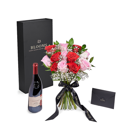 Valentines Day 12 Stem Red & Pink Rose Bouquet With Box & Wine